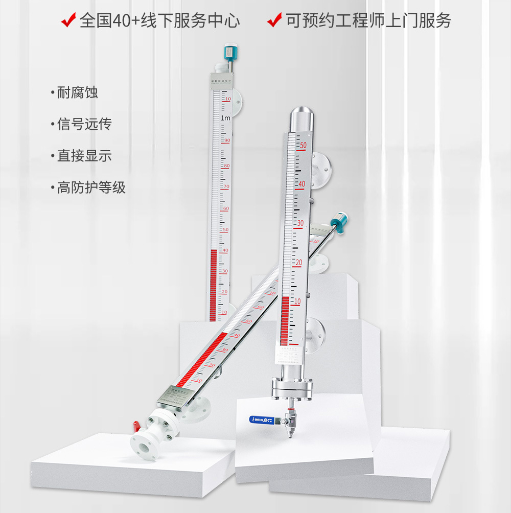 在液位计的主体上安装变送器,可以实现远传显示,变送器由传感器和转换器两部分组成,传感器通过磁浮子上下移动,经磁耦合作用使导管内干簧管(或磁传感器)依次动作,获得电阻信号变化,转换成(4~20)mA 的标准电流信号输出。在液位计主体上安装报警开关,可实现报警或联锁控制。适用于低温到高温、真空到高压等各种环境,是石油化工等行业理想的液位测量产品。
